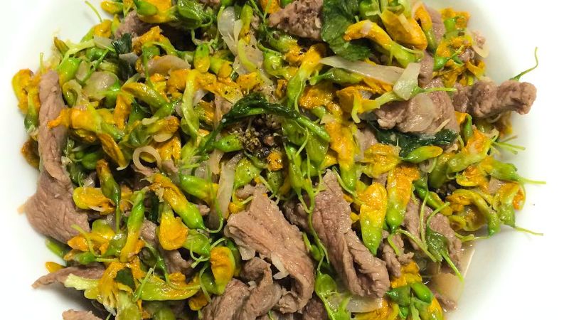 Món ngon từ bông điển điển được kết hợp với thịt bò là món ăn không còn xa lạ với mọi người. Món ăn được kết hợp từ thịt bò, bông điên điển và các gia vị thông dụng. Bên cạnh đó, phần thịt bò được xào chung với bông điên điển chín vừa tới, nêm nếm sao cho vừa ăn là được.